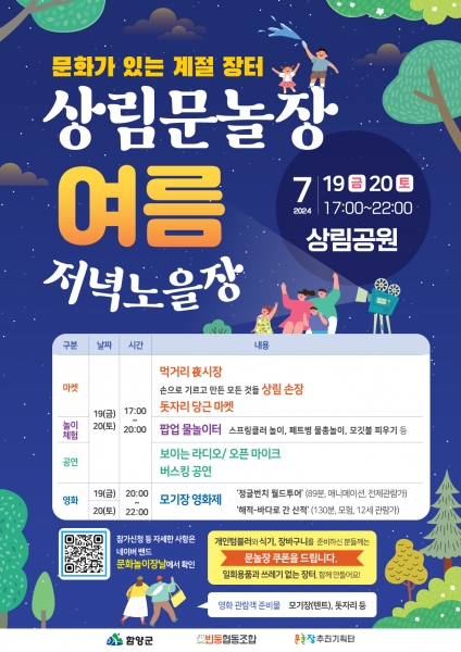 이번 상림 문화놀이장날은 ‘먹거리 夜시장’, 손으로 기르고 만든 모든 것들 상림 손장, 돗자리 당근마켓과 팝업물놀이터, 페트병 물총놀이, 모깃불 피우기와 보이는 라디오/오픈마이크 버스킹공연이 마련되어 있다 또한 오후 8시부터 열리는 모기장 영화제에서는 정글번치 월드투어, 해적-바다로 간 산적을 상영하는 등 다양한 놀이로 누구나 참여 가능한 문놀장이 열릴 예정이다.