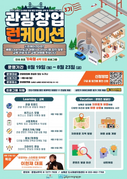 특히 남해군 고유의 관광 콘텐츠를 기획하고 제작 역량을 갖춘 창업가를 발굴하기 위한 현실성 있는 창업 프로그램이 진행될 예정이다.
