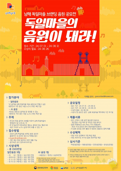 [아시아월드뉴스] 남해관광문화재단이 대한민국 거주자 누구나 참가할 수 있는 ‘남해 독일마을 브랜딩 음원 공모전’을 개최한다.