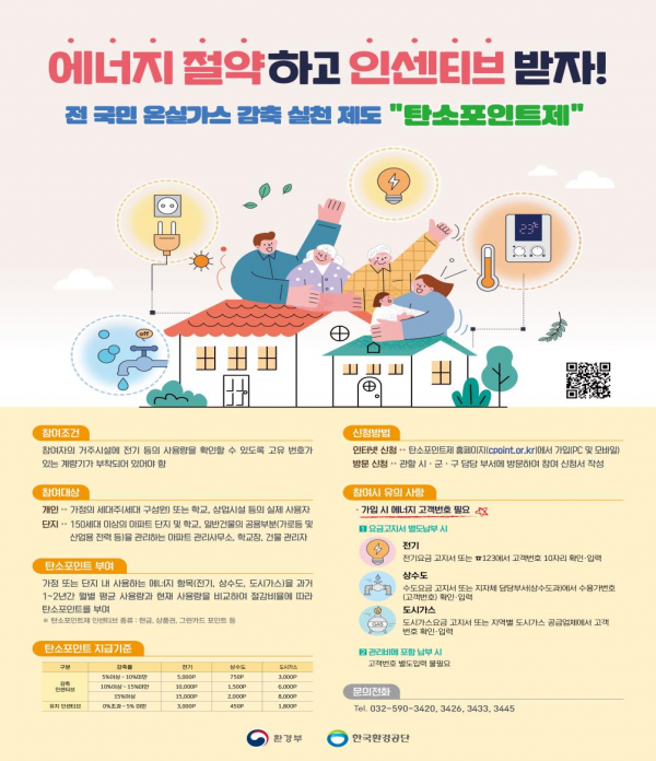 탄소포인트제는 가정, 상업시설 등에서 전기, 수도, 가스 등 과거 2년의 월평균 에너지 사용량과 현재 에너지 사용량을 비교해 감축 비율에 따라 혜택을 지급하는 제도다.