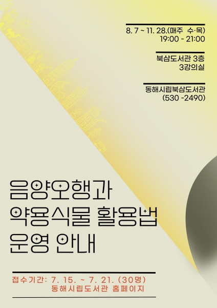 이번 교육은 상반기에 운영한 ‘사상체질과 약용식물 활용법’의 심화 과정으로 북삼도서관에서 8월 7일부터 11월 28일까지 주 2회 오후 7시부터 오후 9시까지 운영한다.
