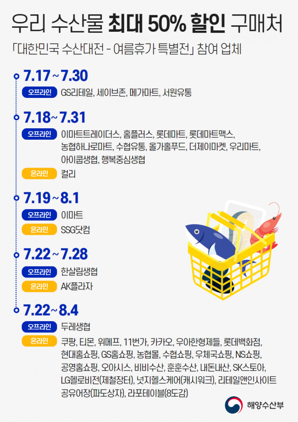 이번 행사는 7월 17일부터 8월 4일까지 진행되며 소비자가 마트와 온라인몰에서 국산 수산물을 구매할 때 구매금액의 최대 50%를 할인받을 수 있다.