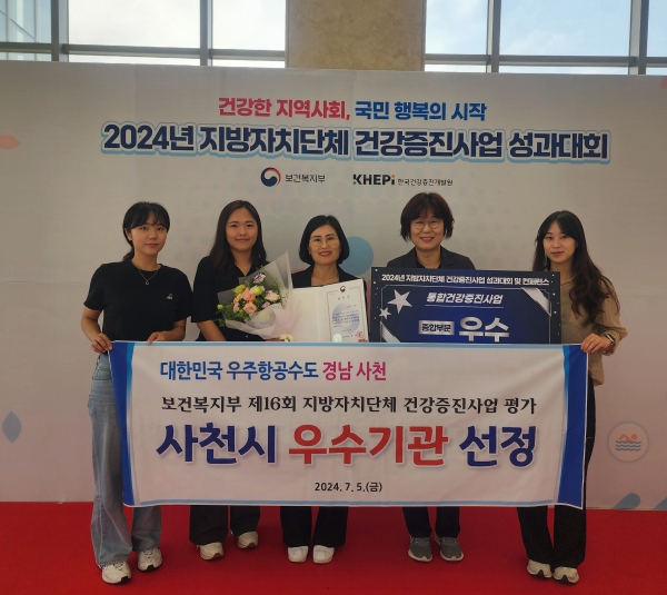 [아시아월드뉴스] 사천시는 ‘2024년 제16회 지방자치단체 건강증진사업 합동성과대회’에서 종합부문 우수기관으로 선정돼 보건복지부 장관 표창을 수상했다고 5일 밝혔다.