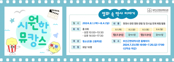 [아시아월드뉴스] 부산근현대역사관은 오는 8월 1일부터 4일까지 여름방학 청소년 역사문화 프로그램 ‘시원한 뮤캉스’ '영화 속 역사 이야기'를 운영한다고 밝혔다.