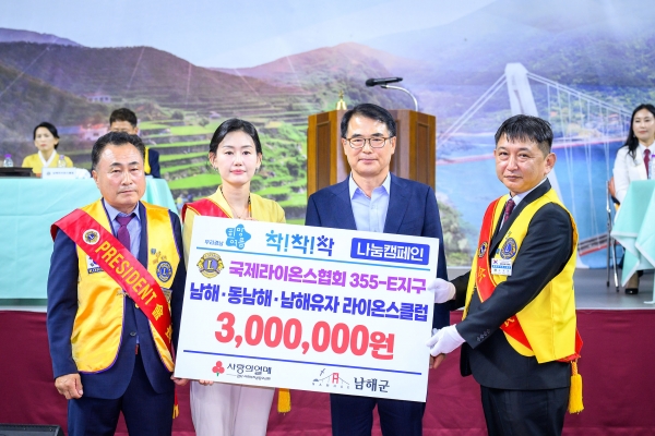 [아시아월드뉴스] 남해군은 지난 5일 남해실내체육관에서 국제라이온스협회 355-E지구 남해·동남해·남해유자라이온스 합동 이·취임식이 열린 가운데 이들 단체에서 이웃돕기 성금 300만원을 기탁했다고 밝혔다.