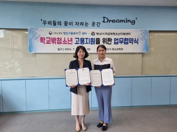 [아시아월드뉴스] 양산시 학교 밖 청소년지원센터는 지난 5일 학교 밖 청소년지원센터 늘봄실에서 고용노동부 양산지청 양산고용복지+센터와 학교 밖 청소년 자립 및 고용지원 강화를 위한 업무 협약식을 개최했다.