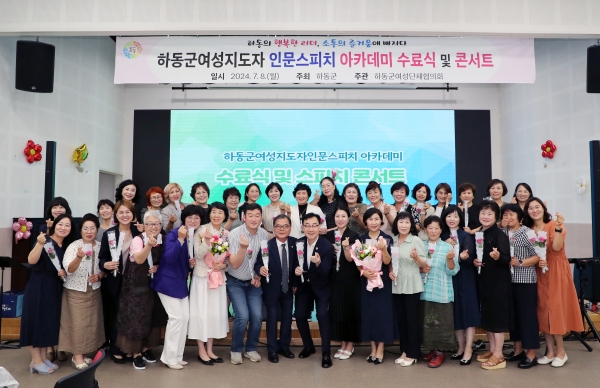[아시아월드뉴스] 하동군은 ‘하동의 행복한 리더 소통의 즐거움에 빠지다’라는 주제로 지난 12주간 진행된 여성 지도자 인문 스피치 교육의 수료식 및 발표회를 8일 하동군노인장애인종합복지관에서 개최했다고 밝혔다.