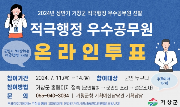 [아시아월드뉴스] 거창군은 2024년 상반기 적극행정 우수사례 및 우수공무원을 선발하기 위해 오는 14일까지 거창군 홈페이지에서 군민대상 온라인 투표를 진행한다.