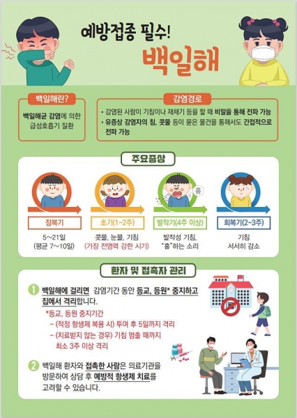 보건소 관계자는 “백일해가 현재 초·중·고등학교를 중심으로 확산하고 있다 의심되는 경우, 등교·등원을 자제하고 개인방역수칙을 잘 지키며 신속하게 의료기관에서 치료를 받아야 한다”고 말했다.