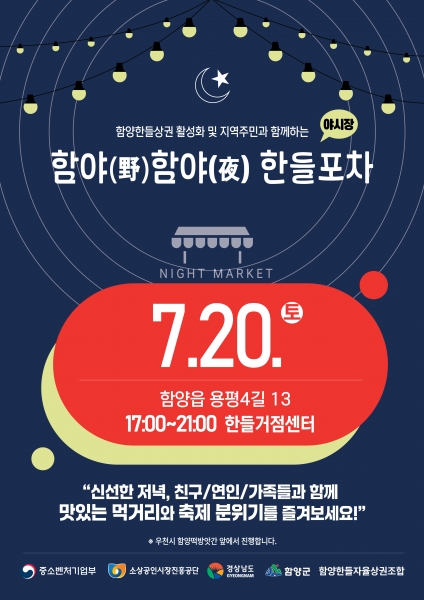 함양한들상권 활성화를 위해 상인들과 지역 주민이 함께 추진하는 ‘함야 함야 한들포차’는 오는 7월20일 오후5시부터 9시까지 한들거점센터 앞에서 열릴 예정이다.