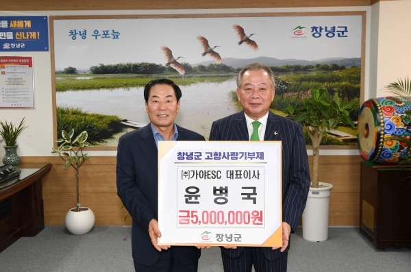 [아시아월드뉴스] 창녕군은 가야ESC 윤병국 대표이사가 지난 11일 고향사랑 기부제 연간 최고 금액인 500만원을 창녕군에 기부했다고 밝혔다.