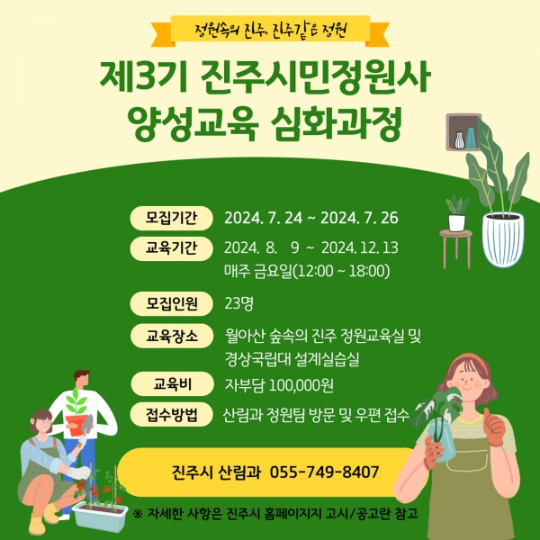 모집기간은 7월 24일부터 26일까지이며 접수는 진주시청 산림과를 방문하거나 우편으로 가능하다.