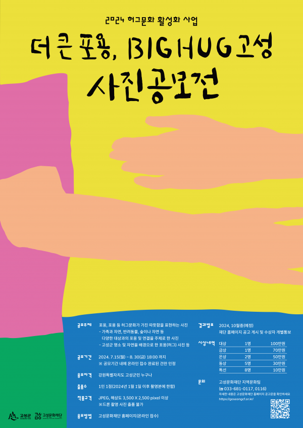 2024 허그 문화 활성화 사업의 일환으로 진행되는 이번 공모전은 포용과 연대, 교류와 소통의 의미를 담은 고성군의 도시문화 브랜드인 허그 문화를 널리 알리고 일상 속 허그문화 확산을 위해 기획됐다.