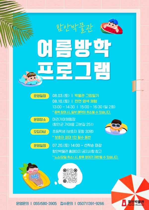마지막 여름방학 프로그램은 매달 아라가야체험장에서 진행되고 있는 함안박물관 교육프로그램으로 이번 8월 3일부터 3주 동안 ‘박물관 그림일기’, ‘천연 염색 체험’, ‘수박터지는 옛날 물총 싸움’을 진행한다.