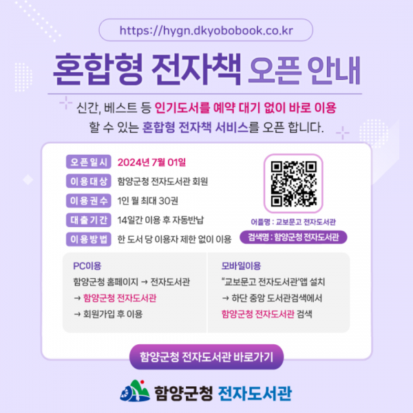 전자책 서비스는 함양군민이라면 누구나 이용이 가능하며 함양군청 누리집과 교보도서관 모바일 어플에서 전자책을 볼 수 있다.