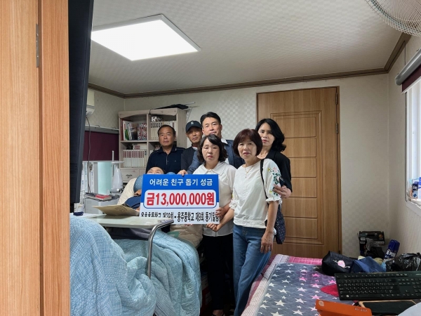 [아시아월드뉴스] 용주면 용호초등학교 제29회 및 용주중학교 제9회 동기회에서는 6월 30일 갑작스런 주택 붕괴로 어려움을 겪고 있는 친구를 방문해 십시일반 자발적으로 모은 성금 1,300만원을 전달하며 위로의 마음을 전했다.