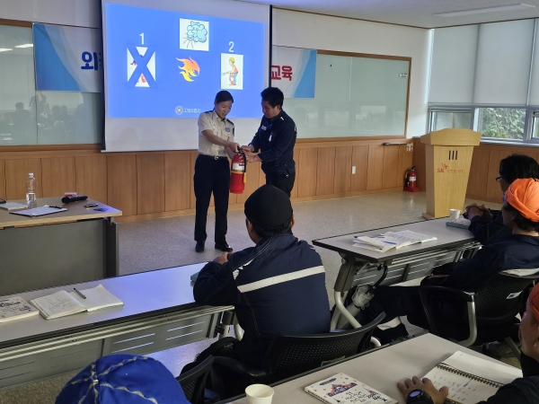 이번 교육은 고성소방서와 SK기술교육원의 협조로 이루어졌으며 SK기술교육원에서 조선관련 교육을 받고 있는 태국 외국인근로자 42명을 대상으로 화재 및 구조·구급 상황 발생시 119신고와 대피방법, 소화기 사용방법 교육 등으로 진행됐다.