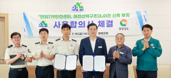 [아시아월드뉴스] 함양군은 7월 19일 군수실에서 진병영 군수, 손대협 함양소방서장 등이 참석한 가운데 안의 119안전센터와 마천 산악구조대의 이전 신축과 관련한 부지 사용 합의서를 체결했다.