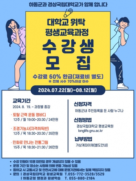 [아시아월드뉴스] 하동군은 8월 19일부터 ‘2024년 하반기 대학위탁 평생교육 프로그램’을 운영하기로 하고 7월 22일부터 8월 12일까지 수강생을 모집한다고 밝혔다.