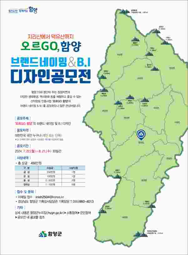 국민 누구나 참여할 수 있는 이번 공모전은 ‘오르GO, 함양’의 브랜드 네이밍과 이미지 및 응용 디자인 등을 공모하며 모두 9점을 선정할 예정으로 금상 1점 200만원, 은상 1점 100만원, 동상 2점 각 50만원, 장려상 5점 각 10만원 등 총상금 450만원 규모이다.