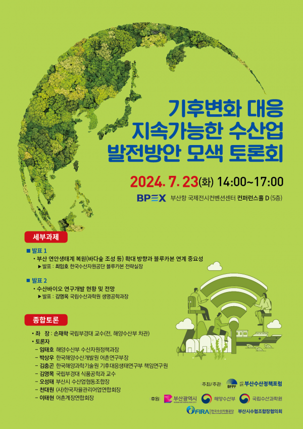 [아시아월드뉴스] 부산시는 오늘 오후 2시 부산항국제전시컨벤션센터 컨퍼런스홀에서 ‘기후변화 대응, 수산업 발전방안 모색 토론회’가 열린다고 밝혔다.