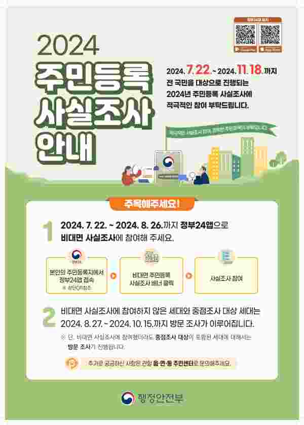 군 관계자는 “주민등록 사실조사는 국가와 지방자치단체의 정책 수립에 밑바탕이 되는 중요한 조사”며 “7월 22일부터 시작되는 2024년 주민등록 사실조사에 군민 여러분의 적극적인 참여와 협조를 부탁드린다”고 말했다.
