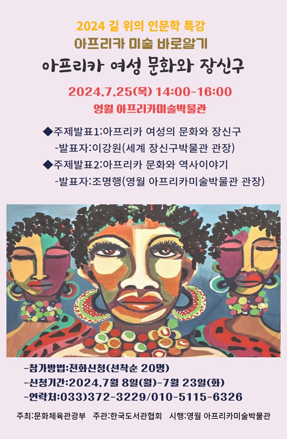 [아시아월드뉴스] 영월 아프리카미술박물관은 2024년 7월 25일오후 2시부터 4시까지 박물관 교육관에서 “2024 길 위의 인문학 특강”을 개최한다.