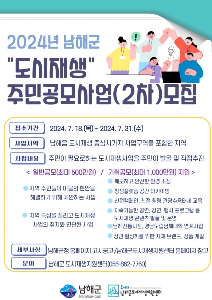 [아시아월드뉴스] 남해군이 ‘2024년 도시재생 주민 공모사업’ 참여자를 7월 18일부터 7월 31일까지 모집한다고 밝혔다.