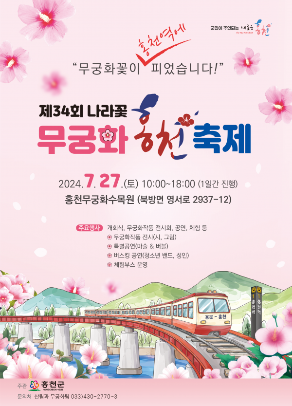 이번 제34회 나라꽃 무궁화 홍천축제는 용문 홍천철도 조기 착공을 염원하고자 “무궁화꽃이 홍천역에 피었습니다’라는 주제로 열린다.