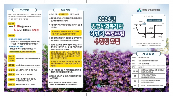 [아시아월드뉴스] 함양군종합사회복지관은 오는 7월 29일부터 8월 2일까지 5일간 군민 복지 증진 및 평생학습 기회 제공을 위해 함양군에 주소를 둔 군민들을 대상으로 교육, 취미, 여가, 문화 부문 ‘2024년 종합사회복지관 하반기 프로그램’ 수강생을 모집한다.