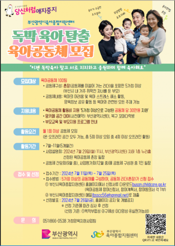 우미옥 시 여성가족국장은 “아이를 낳는 것도 키우는 것도 귀한 시대에 육아하는 부모님들은 더욱 존경받아야 한다”며 “이번 독박육아탈출 육아공동체 사업을 통해 고민과 스트레스 없이 함께 키우는 육아 문화를 조성하고 부산형 돌봄 '당신처럼 애지중지'와 연계해 긍정적인 육아 경험을 제공함으로써 저출생 극복에 도움이 되기를 기대한다”고 전했다.