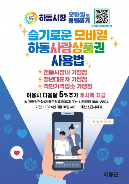 사업은 2024년 8월 1일부터 예산 소진 시까지 진행되며 모바일 하동사랑상품권 가맹점 정보는 하동군 홈페이지 혹은 배부될 홍보물의 가맹점 현황 QR보기를 통해 확인할 수 있다.