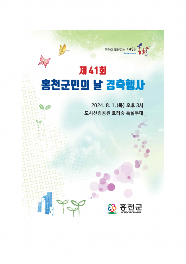 [아시아월드뉴스] 홍천군은 제41회 홍천군민의 날 경축 행사를 8월 1일 오후 3시 도시산림공원 토리숲 특설무대에서 개최한다.