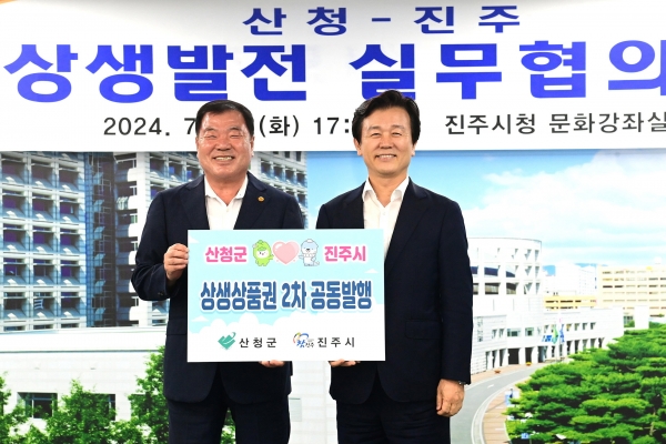 특히 다가올 추석 명절과 축제 등을 맞아 2023년 9월 1차 발행에 이어 올해 9월에도 10억원의 규모로 ‘산청-진주 상생상품권’을 2차 공동발행할 것을 협약해 지역경제 활성화와 양 시군의 경제적 동반 상생발전을 촉진하는 계기가 마련됐다.