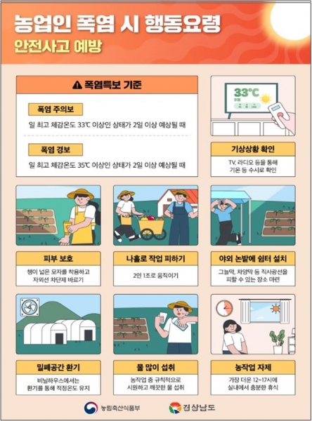 함양군 관계자는 “고령 농업인의 경우 급격한 온도 변화에 적응하기 어렵고 땀을 조절하는 신체 능력이 취약할 수 있기 때문에 조심해야 한다”며 “시원한 곳에서 머무는 시간을 늘리고 평소보다 물을 더 많이 마셔야 한다 평소 농작업 안전 수칙을 숙지하고 반드시 지켜 안전사고를 예방해야 한다”고 당부했다.