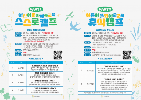[아시아월드뉴스] 고성문화재단은 여름방학과 휴가를 맞이한 어린이들과 성인들을 위한 문화예술교육 프로그램 ‘2024 예술로 바캉스 ‘스스로 캠프’, ‘휴식캠프’’ 참여자를 모집한다.