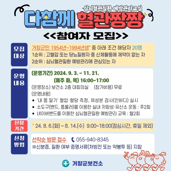 [아시아월드뉴스] 거창군은 오는 6일부터 ‘다함께 혈관짱짱’ 심뇌혈관질환 예방관리교실 참여자 20명을 선착순 모집한다.