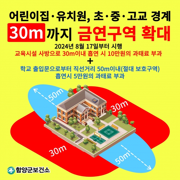 [아시아월드뉴스] 함양군은 국민건강증진법 개정에 따라 오는 17일부터 관내 어린이집과 유치원, 초·중·고등학교 총 45개소의 금연구역을 확대·신설 지정한다고 5일 밝혔다.