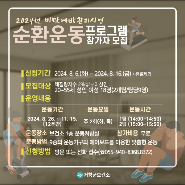 [아시아월드뉴스] 거창군은 8월 6일부터 16일까지 2주간 비만예방관리사업 ‘순환운동 프로그램’ 참여자 18명을 선착순 모집한다고 밝혔다.