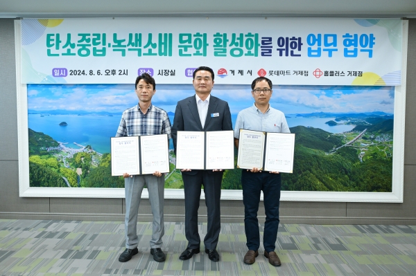 [아시아월드뉴스] 거제시는 6일 시장실에서 탄소중립·녹색소비 활성화를 위해 롯데마트 거제점, 홈플러스 거제점과 업무협약을 체결했다.
