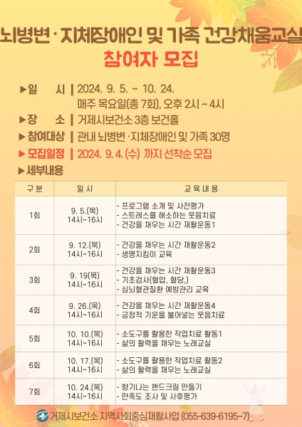 관내 뇌병변·지체 장애인이라면 누구나 참여 가능하며 9월 4일까지 거제시보건소 지역사회중심재활사업 담당자가 선착순으로 접수를 받는다.