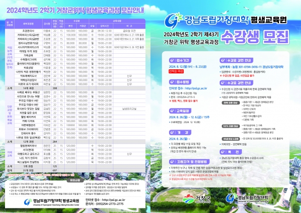 [아시아월드뉴스] 거창군은 경남도립거창대학에 위탁해 운영하고 있는 2024년도 평생교육과정 2학기 수강생을 거창대학 평생교육원 및 국제협력원 홈페이지를 통해 8월 12일 오전 9시부터 선착순 모집한다.