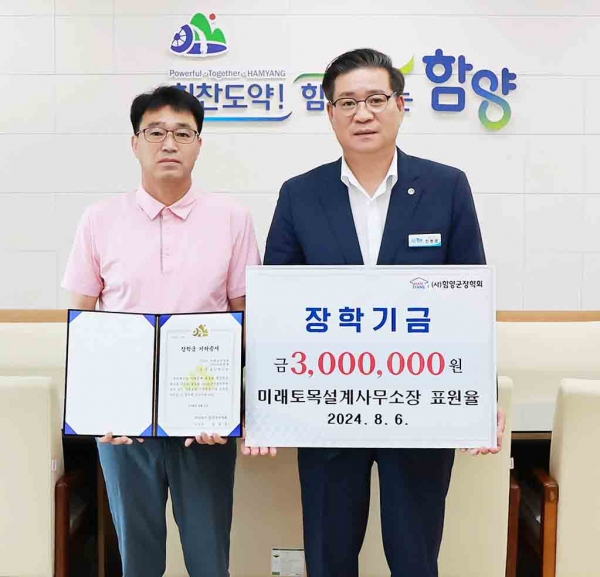 [아시아월드뉴스] 함양군 지역 인재육성을 염원하는 기부 문화가 확산하고 있는 가운데 8월 6일 미래토목설계사무소 표원율 소장이 함양군장학회에 장학금 300만원을 기탁했다.