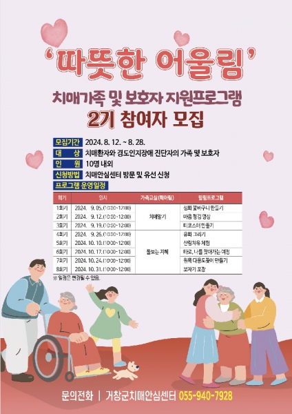 [아시아월드뉴스] 거창군은 이달 12일부터 28일까지 치매가족 지원프로그램 ‘따뜻한 어울림’에 함께할 치매가족 10명을 선착순 모집한다.