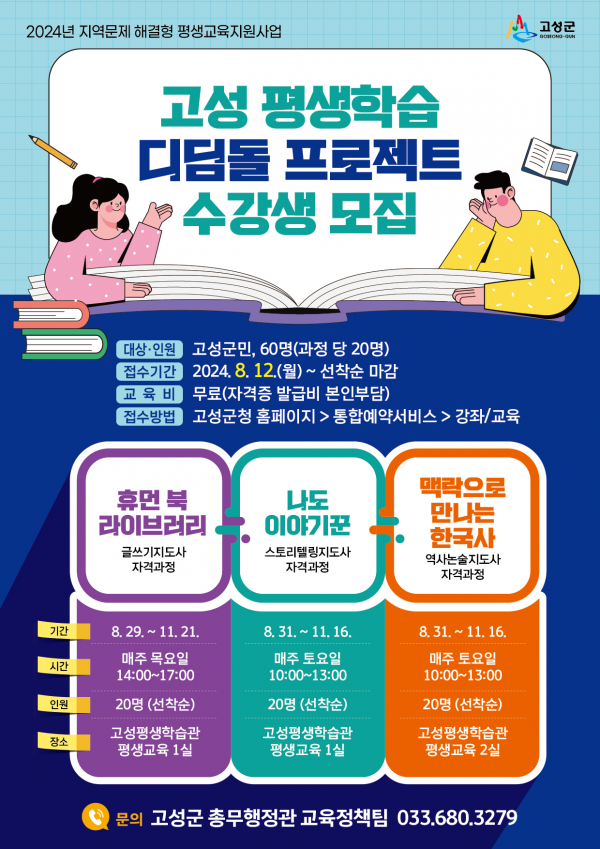 이번 프로그램은 고성군에서 활동할 인문·교양 분야의 강사를 양성하고자 기획된 자격증 과정으로 △ 휴먼 북 라이브러리 △ 나도 이야기꾼 △ 맥락으로 만나는 한국사로 구성되어 있으며 8월 말부터 11월 말까지 프로그램을 운영할 계획이다.
