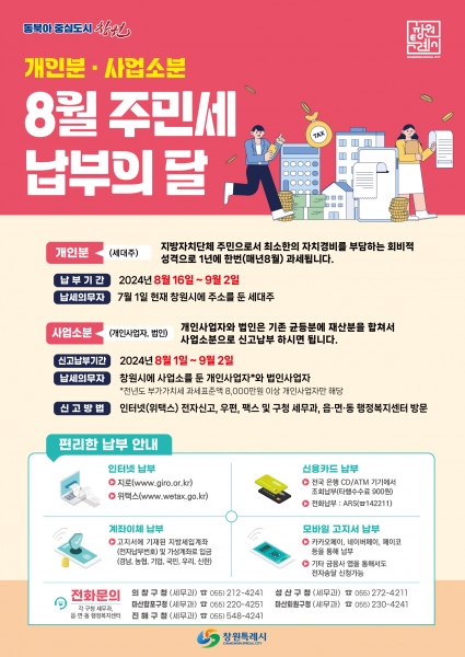 창원시는 시민들의 편리한 주민세 납부를 위해 은행이나 관청을 방문하지 않고 전국 공통 ARS 서비스, 가상계좌납부, 전화납부, 모바일 납부, 위택스로도 납부할 수 있는 다양한 납세편의 시책을 운영하고 있다.