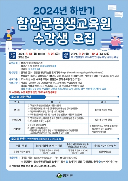 [아시아월드뉴스] 함안군은 2024년 하반기 평생교육원 정규강좌 수강생을 오는 13일부터 23일까지 선착순으로 모집한다고 밝혔다.