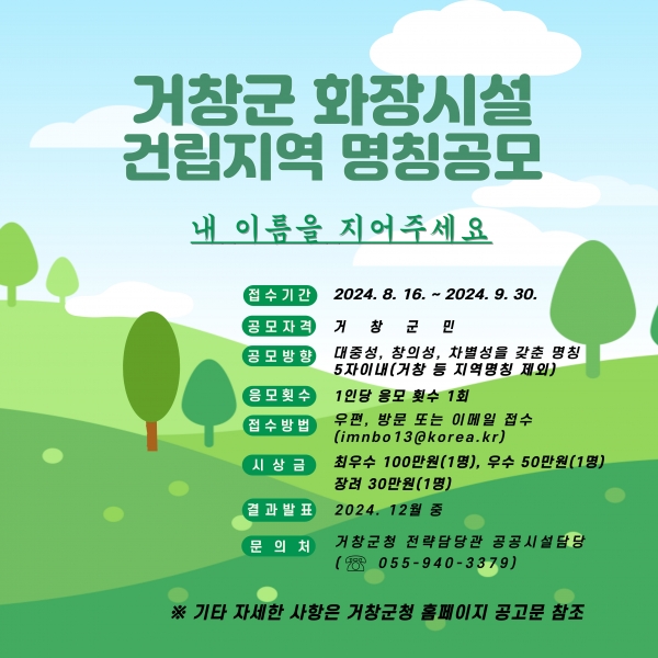 이번 공모전을 통해 거창군은 ‘거부감 없는 공원 같은 화장시설’의 이미지를 널리 부각시키며 대중성, 창의성이 돋보이는 명칭을 선정할 예정이다.