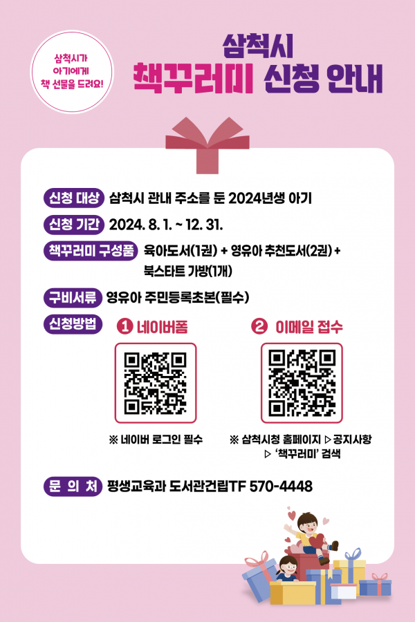 주소지가 삼척시인 2024년생 출생 아동은 누구나 책꾸러미 신청이 가능하며 자세한 사항은 삼척시청 홈페이지에서 확인할 수 있고 문의사항은 삼척시 평생교육과로 연락하면 된다.