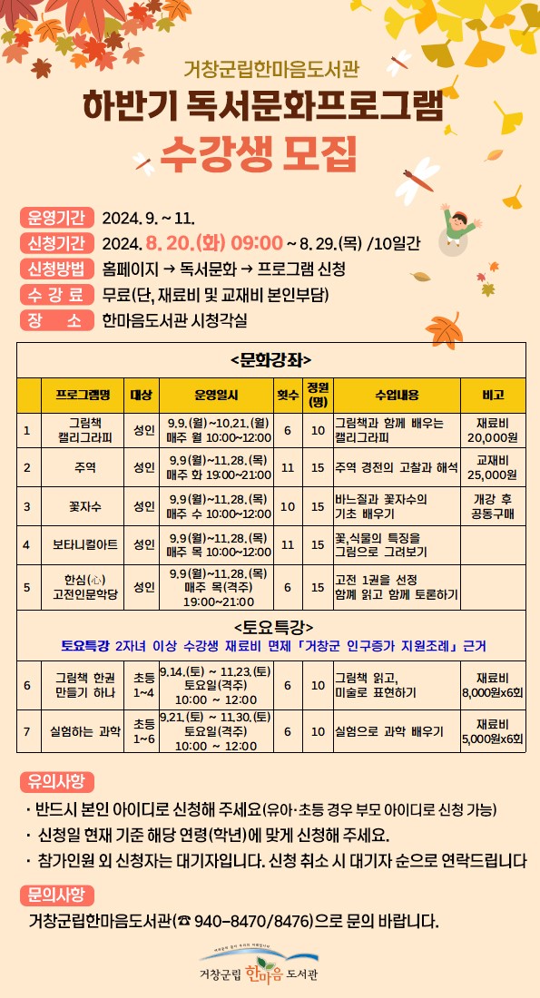 프로그램은 9월 9일부터 11월 28일까지 진행되며 문화·예술·독서 등 다양한 분야의 7개 강좌가 운영될 예정이다.